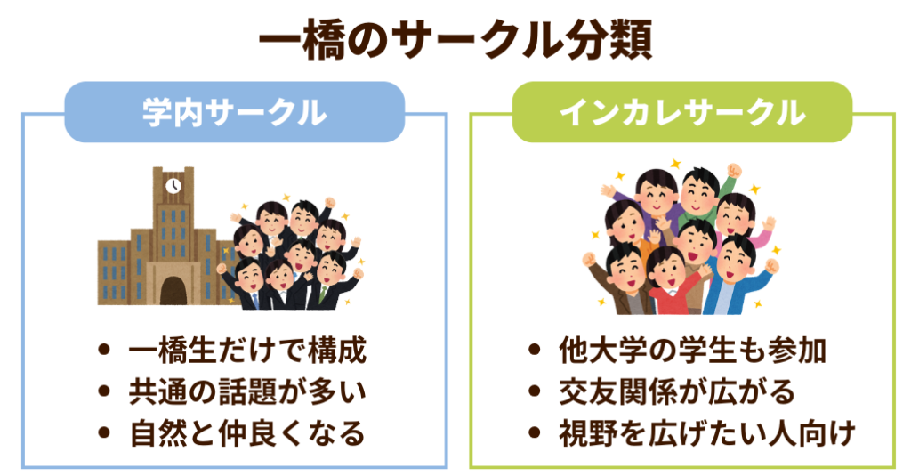 一橋のサークルは、大きく「学内サークル」と「インカレサークル」に分けられます。