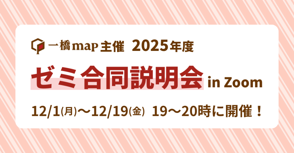 12/1(月)から、毎日19時よりZoomでゼミ合同説明会を開催しています。参加ゼミのスケジュール・配信リンクは一橋map公式LINE限定でお届けしています。ぜひご登録の上、ゼミを探してみてください!