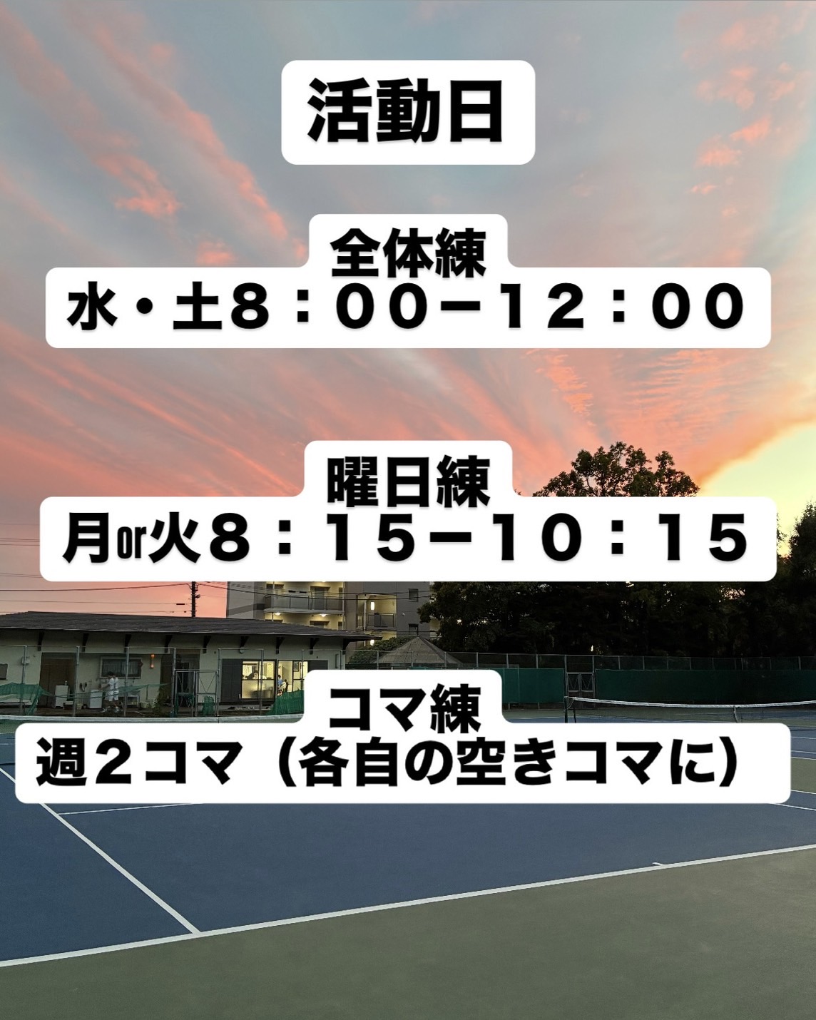 | 活動日 | 月or火曜8:15〜10:15 水・土曜8:00〜12:00 週2コマ(各自の空きコマ) |