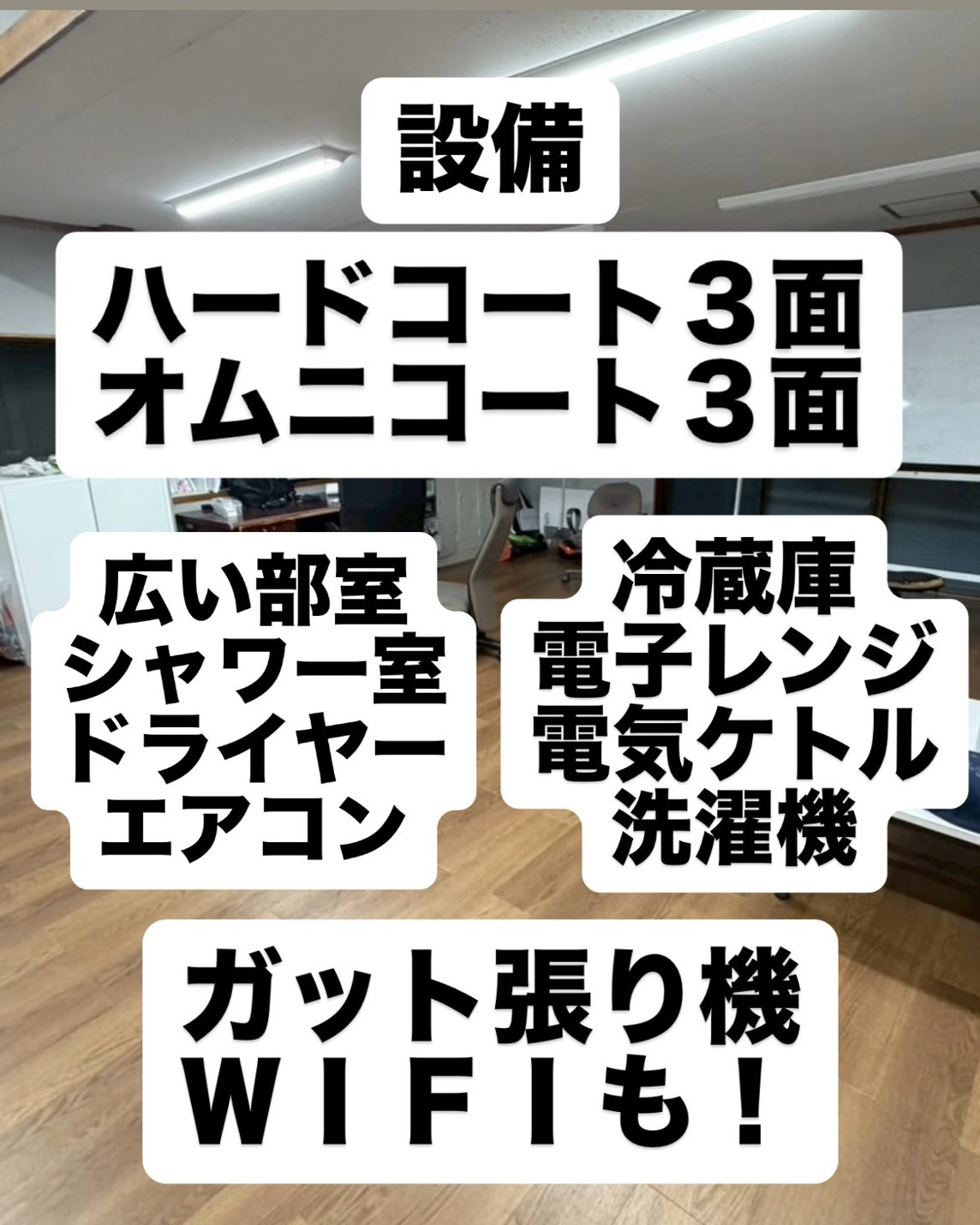 広い部室、シャワー室、エアコン、ガット張り機、Wi-Fiなどの環境設備が整っているのも魅力です!