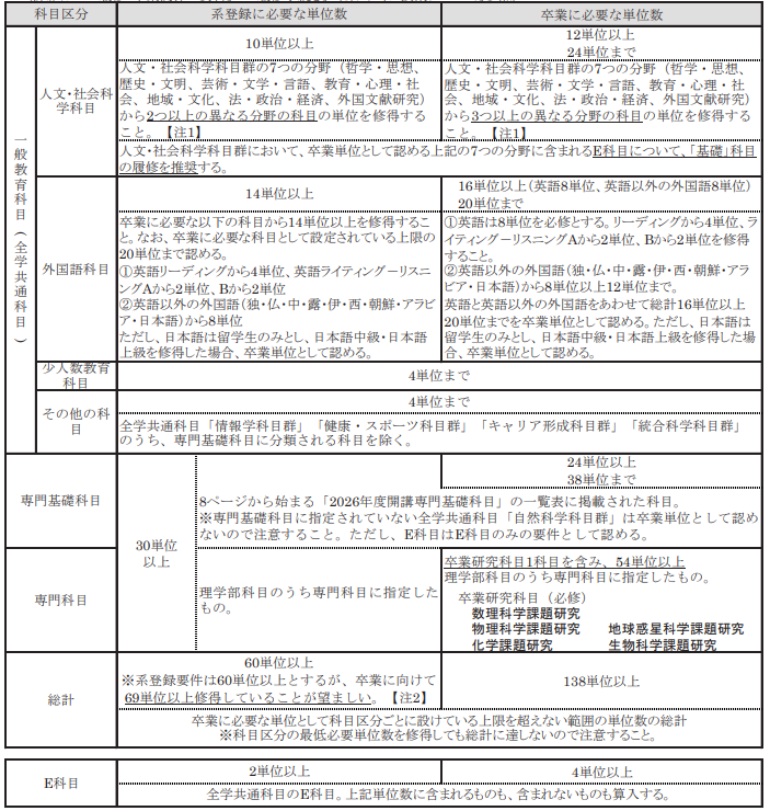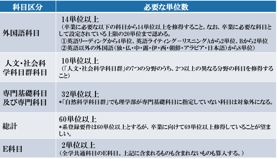 理学部ではE科目群として必修単位数が設定されています。必ず履修しましょう。