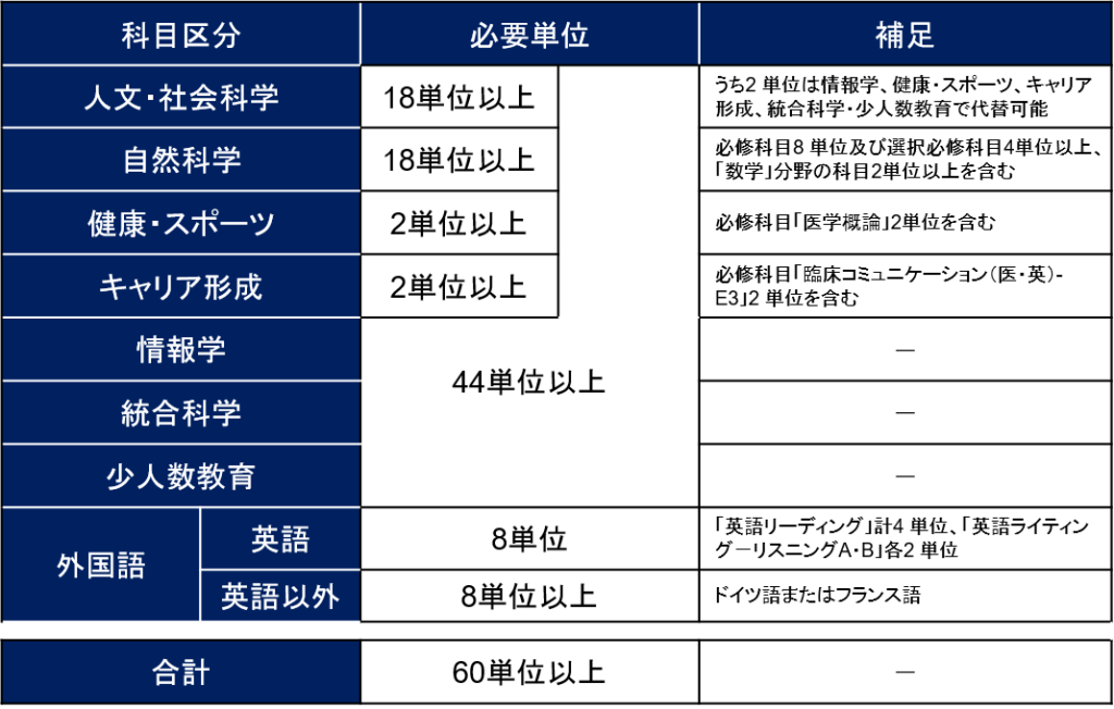 1回生において専門科目は多くなく、主に全学共通科目をはじめとする基礎教養科目を履修することになります。医学部のみなさんが、卒業までに修得すべき全学共通科目は以下の通りです。