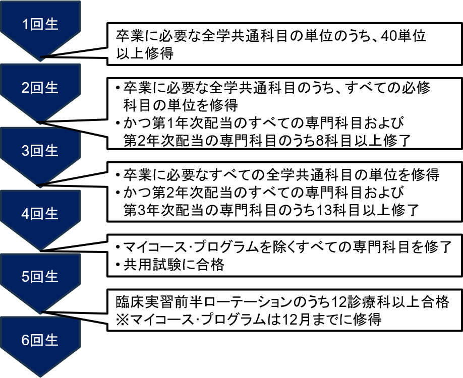 なお、医学部医学科では各回生への進級要件が細かく設定されています。