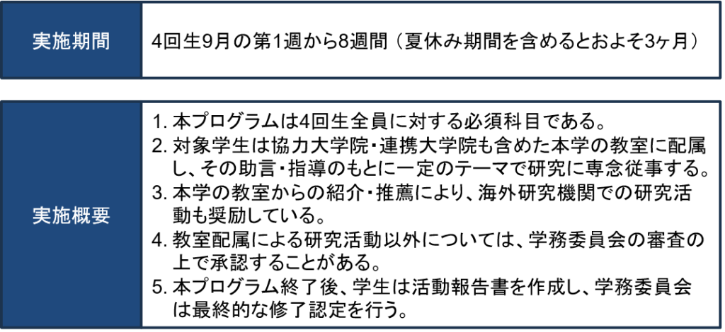 実施期間中は他の講義や実習がないので、研究活動により集中できるかと思います。このプログラム中の研究成果が、国際学会などで発表されることもあるそうなので、みなさんぜひ熱心な研究活動を行ってください!