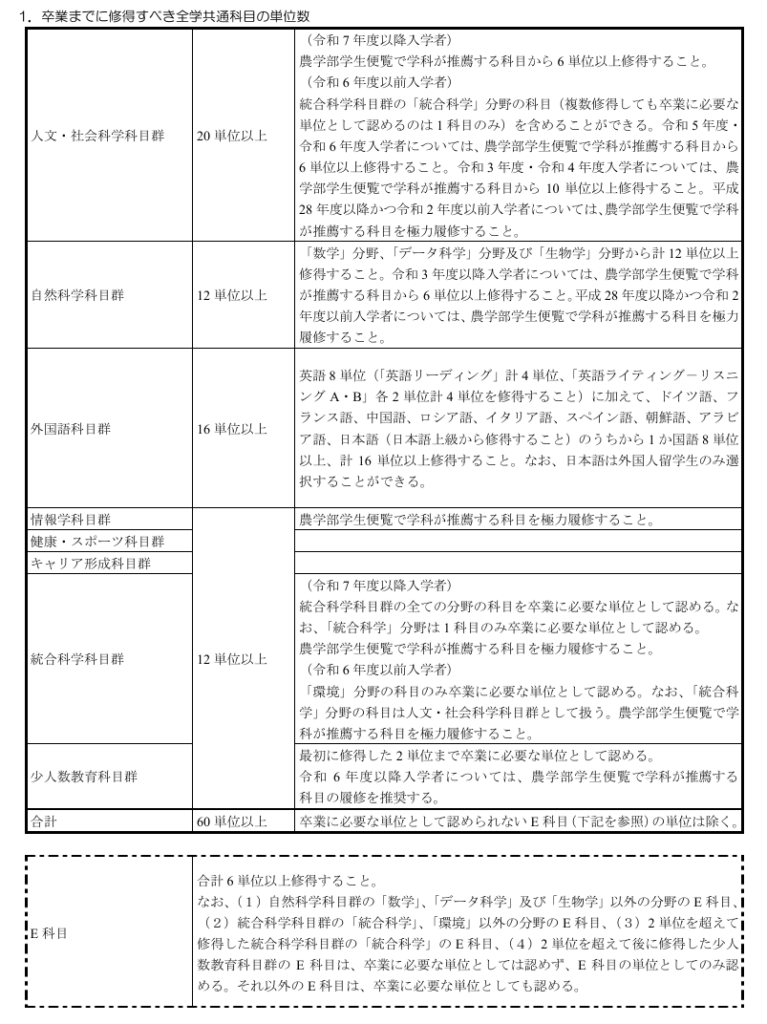 右の欄を見るとわかると思いますが、食料・環境経済学科のみなさんは他学部・学科と比較して全学共通科目の指定が細かいです。