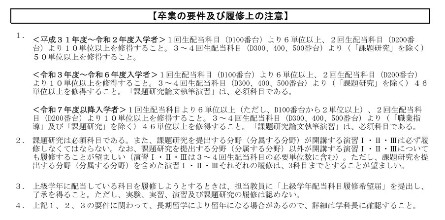 ここで注意してほしい点は、専門科目の卒業要件に書かれているように、「課題研究を提出する分野(分属する分野)が開講する演習I・II・IIIは必ず履修しなくてはならない」ということです。