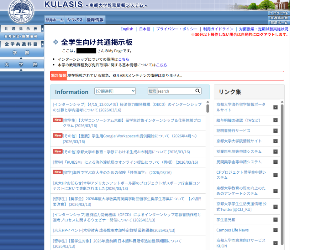 KULASISを開くと大抵最初に出てくるページ。どうでもよい…と見せかけて、留学・就活・イベント・奨学金といった掘り出し物の情報が転がっているので、こまめにチェックをするといいでしょう。