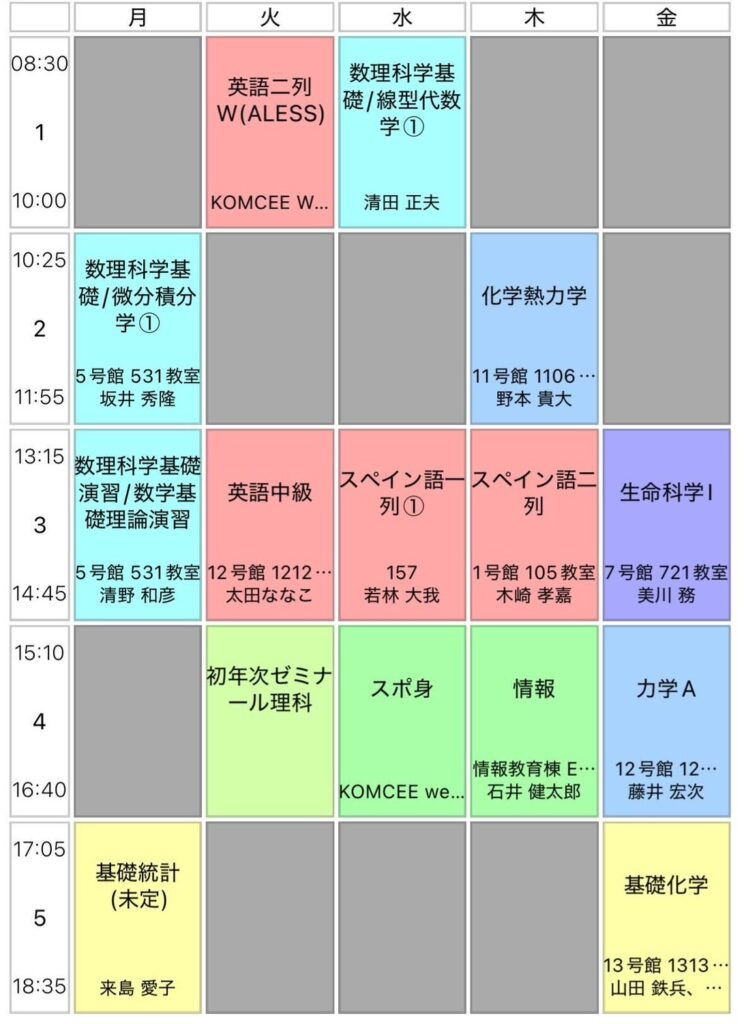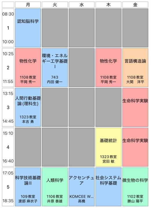 こちらは取得単位数が進振りに影響する農学部志望の学生の時間割なのでコマ数が多いですが、このうち必修は物性化学と生命科学実験のみになります。