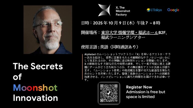 この度、東京大学とGoogle、そしてAlphabet傘下の研究開発機関 X, the Moonshot Factory の共催で、特別講演「ムーンショット・イノベーションの秘密」を開催します。