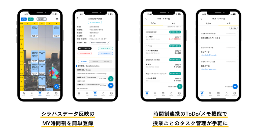 TICの一番の強みは、なんといってもシラバスデータを反映したMY時間割を簡単に登録できることです。さらに、MY時間割と連携したToDo・メモ機能で、授業ごとのタスク管理も手軽にできます。たくさんの授業をとっていると、「どの授業で、いつまでに何を提出するんだっけ?」と、ついつい忘れてしまいがちですが、TICで管理すれば一気に解決です。