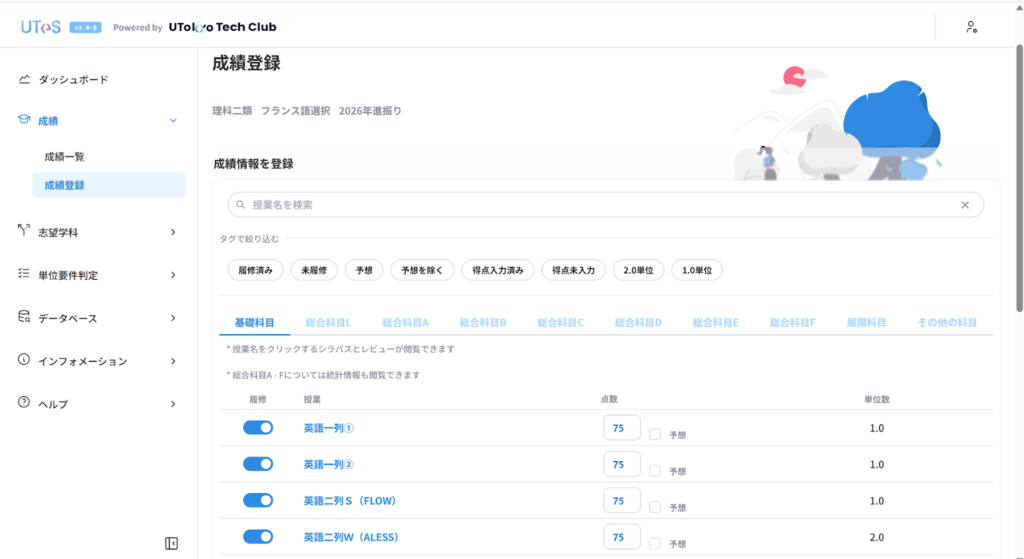成績登録が終わると、仮の点数を含めた得点計算が自動で行われ、ダッシュボードで自分の基本平均点を確認することができます。UTASでは未取得の点数が0点として算入されてしまいますが、UTESでは自分が取得した科目だけの基本平均点も算出してもらえます。