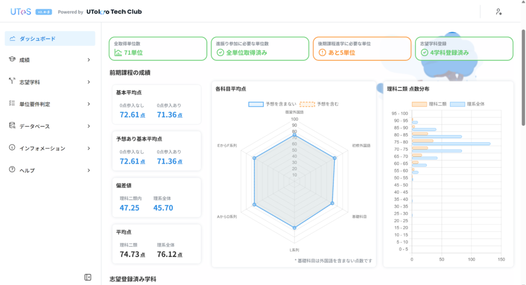 進学選択は、東大生にとって大きな節目となるイベントです。履修や成績管理にはどうしても不安がつきまといますが、UTESを使うことで、自分の状況を大まかに把握しながら、余裕を持って準備を進めることができます。