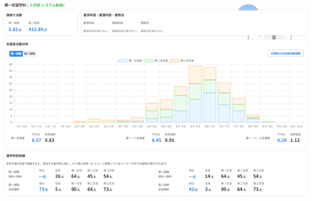 志望学科一覧では、同じ学科を志望する他のユーザーと成績を比べることができます。自分のおおよその立ち位置を確認できるので、実際の進学選択の際にどの学科に志望を出すかの参考にすることができます。