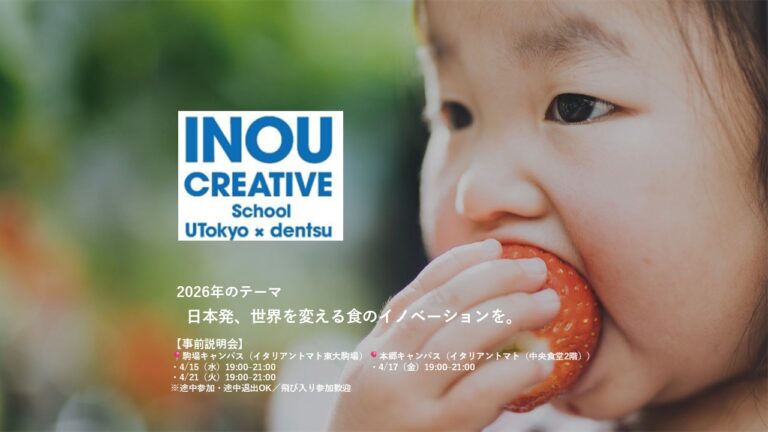 今回募集するUCOP電通企画「INOU CREATIVE School」は、東大の学知と電通のクリエイティビティをもとに、社会問題解決のモデルケースとなる新しいアイディア(ソリューション)を生み出すことを目指すプログラムです。 参加学生による優れたアイディアは、次年度以降に電通の社内プロジェクトとして本学と連携しながら社会実装に向けて推進していきます。