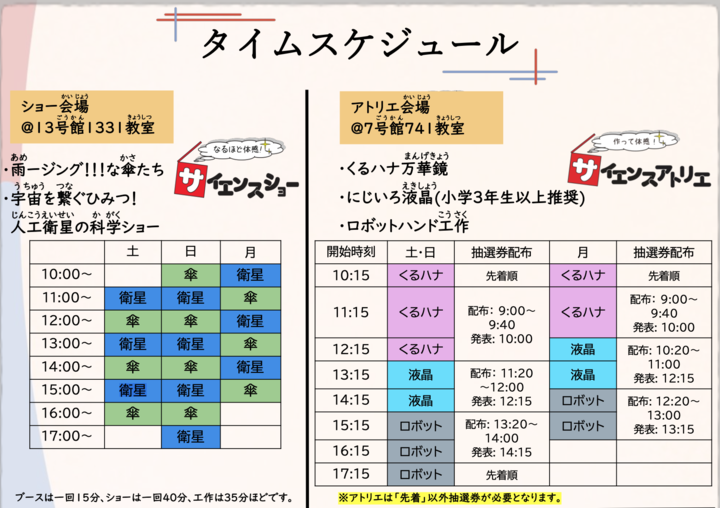 「サイエンスミュージアム」については、駒場祭の開催時間中、常時開いているので、いつ来ても参加いただけます。